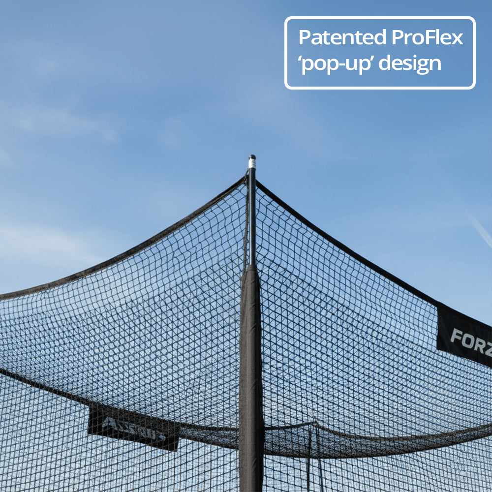 The FORZA ProFlex pop-up net typically measures 7ft x 7ft or 10ft x 7ft depending on the model (check your specific variant on this page).